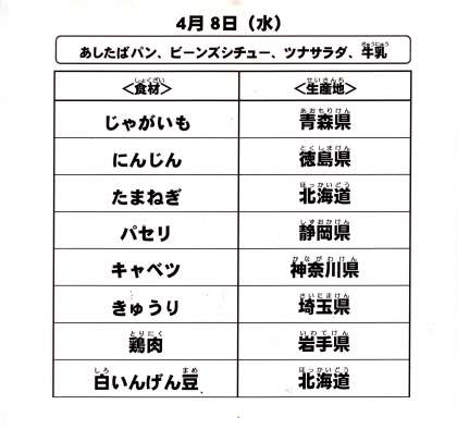 本日の給食で使用した主な食材の産地は以下の通りです。