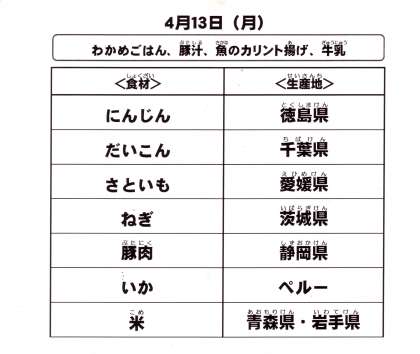 本日の給食で使用した食材の主な産地は以下の通りです。