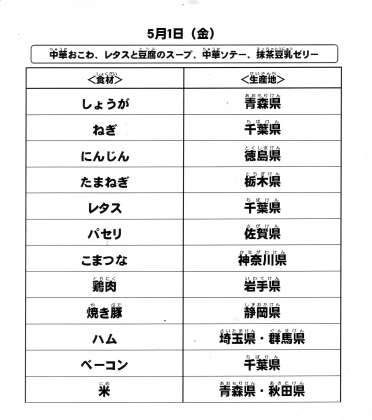 本日の給食で使用した主な食材の産地は以下の通りです。