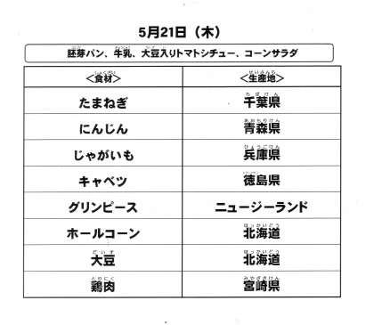 本日の給食で使用した主な食材の産地は以下の通りです。