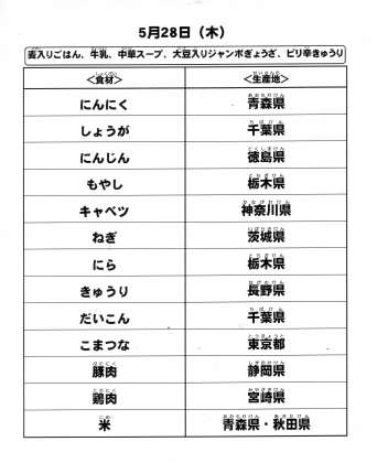 本日の給食で使用した主な食材の産地は以下の通りです。