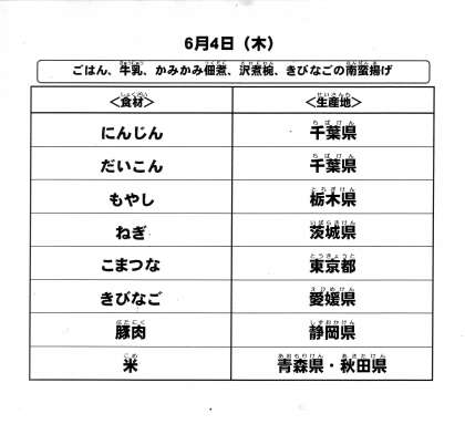本日の給食で使用した主な食材の産地は以下の通りです。
