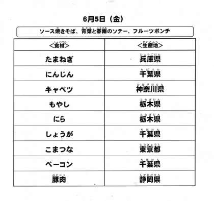 本日の給食で使用した食材の主な産地は以下の通りです。