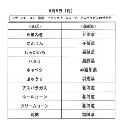 本日の給食で使用した主な食材の産地は以下の通りです。