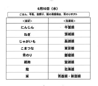 本日の給食で使用した主な食材の産地は以下の通りです。