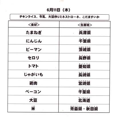 本日の給食で使用した主な食材の産地は以下の通りです。