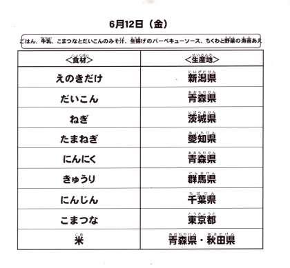 本日の給食で使用した主な食材の産地は以下の通りです。