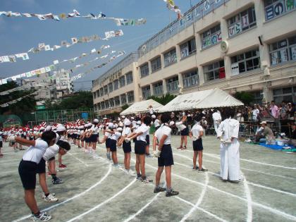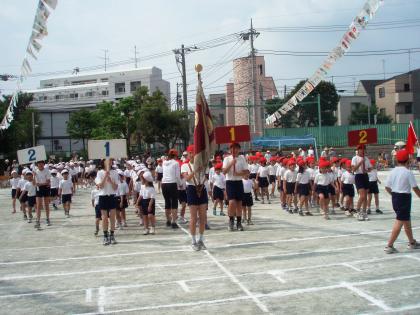 薄日がさす中、予定通り開会式を行いました。校旗、優勝旗、準優勝楯、大玉杯を先頭に胸を張っての入場行進の後、1年・2年・3年・4年・5年・6年の順に入場をしました。1年生のちかいの言葉も練習通り、上手にできました。運動会の歌も赤白とも今日の優勝を目指し、力いっぱい声を出しました。