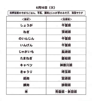 本日の給食で使用した主な食材の産地は以下の通りです。