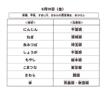 本日の給食で使用した主な食材の産地は以下の通りです。