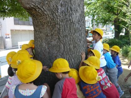 「大きな木だね!一人じゃ抱えられないよ!」