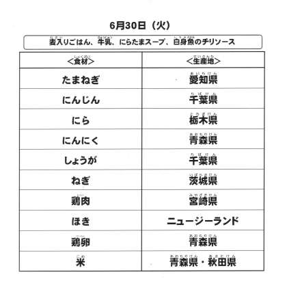 本日の給食で使用した主な食材の産地は以下の通りです。