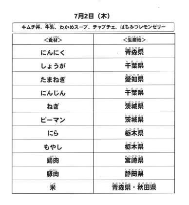 本日の給食で使用した主な食材の産地は以下の通りです。