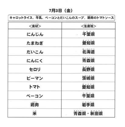 本日の給食で使用した主な食材の産地は以下の通りです。