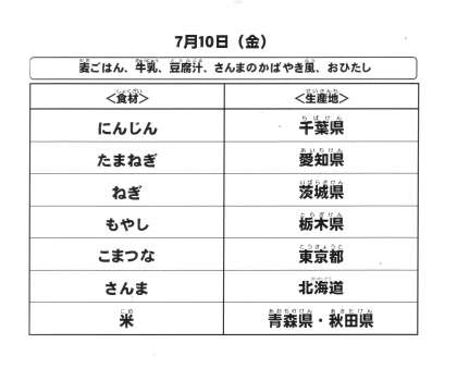 本日の給食で使用した主な食材の産地は以下の通りです。