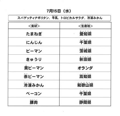 本日の給食で使用した主な食材の産地は以下の通りです。