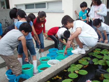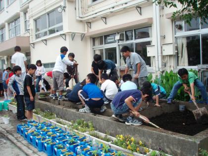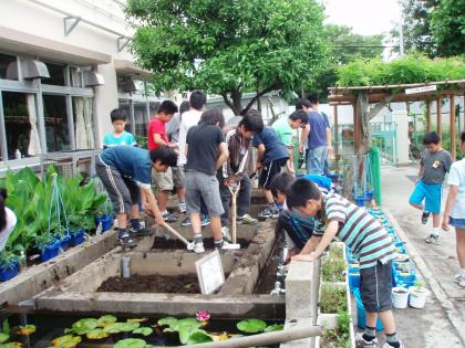 5年生の社会科では、日本の重要な農産物である稲作についての学習をしますが、この東玉川では近隣に水田がなく、その代わりとして、小さな水田を作って実際に育てながら学習をします。目の前で稲穂が実っていく様子を観察しながら、育てていく難しさを学習します。