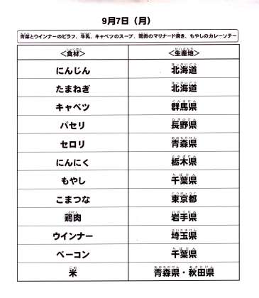 本日の給食で使用した主な食材の産地は以下の通りです。