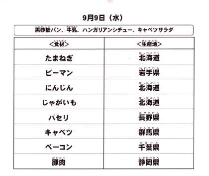 本日の給食で使用した主な食材の産地は以下の通りです。