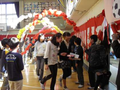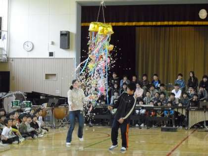 写真は、くす玉わりと6年生が退場する様子です。くす玉がわれ、「おめでとう」と書かれた垂れ幕が紙吹雪とともにおりてきた瞬間、感嘆の声があがりました。