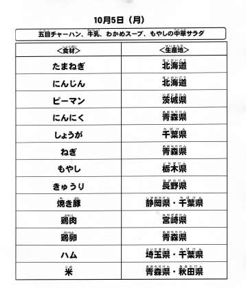 本日の給食で使用した主な食材の産地は以下の通りです。