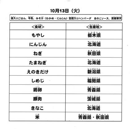 本日の給食で使用した主な食材の産地は以下の通りです。