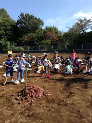 いもほりが始まりました。手前は収穫したいもです。どんどん集まっています。