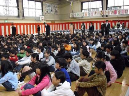 修了式では、各学級の代表児童が修了証を受け取りました。また、1年生と4年生の代表児童が1年間を振り返り、できるようになったことやこれからの目標について話してくれました。最後に校歌斉唱があり、平成21年度修了式は無事終了しました。