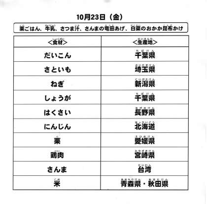 本日の給食で使用した主な食材の産地は以下の通りです。