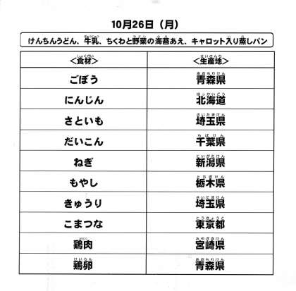 本日の給食で使用した主な食材の産地は以下の通りです。