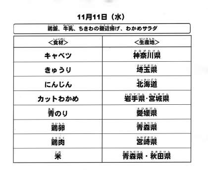 本日の給食で使用した主な食材の産地は以下の通りです。