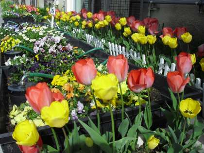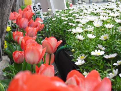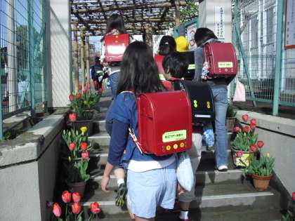 あひる門、正門の両脇に咲き誇るチューリップは、入学式にあわせ校舎の北側で育ててきたものを、4月はじめに子どもたちの進級や入学を祝って、それぞれの場所に移されたものです。