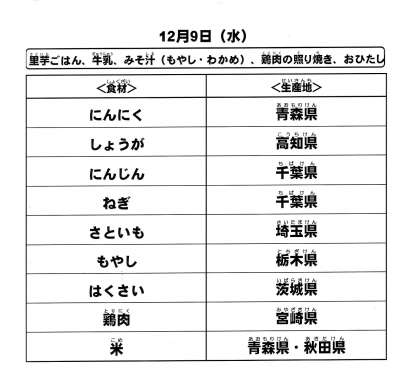 本日の給食で使用した主な食材の産地は以下の通りです。