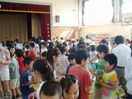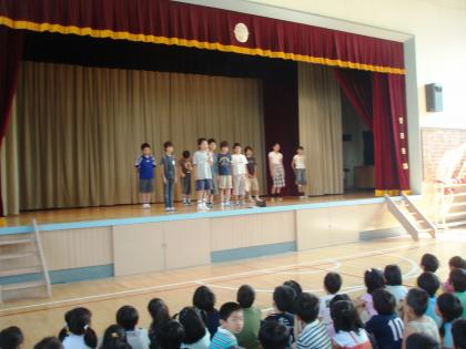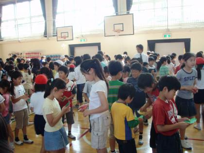 今日の児童集会は、いろいろな学年の人と仲良くなれる七色ジャンケンでした。1年生から6年生まで、それぞれ学年色のカードに、絵やメッセージを書きました。先生達の紫のカードと合わせて全部で七色のカードが準備されました。ジャンケンをして勝つとあいてのカードをもらうことができます。七色のカードを集めるゲームです。仲良しの友だちだけでは、全部の色を集めることはできません。普段話をしたことのない友だちや他の学年の人とコミュニケーションを図る機会でもあります。たくさんの友だちが七色のカードを集めることができました。