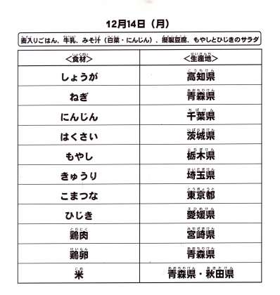 本日の給食で使用した主な食材の産地は以下の通りです。