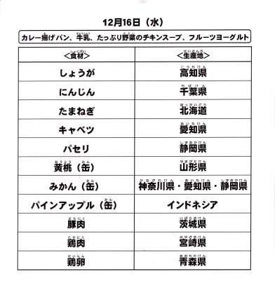 本日の給食で使用した主な食材の産地は以下の通りです。