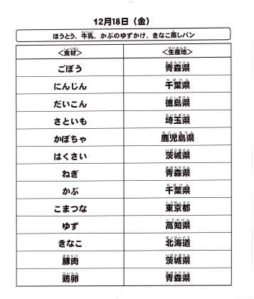 本日の給食で使用した主な食材の産地は以下の通りです。