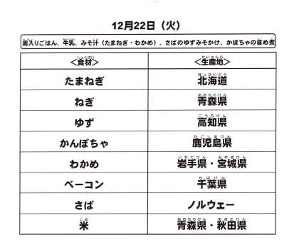 本日の給食で使用した主な食材の産地は以下の通りです。