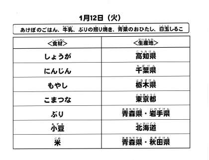 本日の給食で使用した主な食材の産地は以下の通りです。