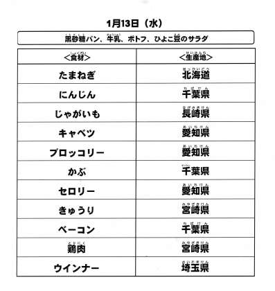 本日の給食で使用した主な食材の産地は以下の通りです。