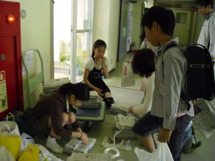 本校では、平成17年度から環境教育を推進し、現在では本校の特色ある教育活動として教育計画にも位置付け、さまざまな学習をしています。特に、フラワースクールやエコ活動モデル校としての活動が進むにつれて、児童会エコ委員会の活動を通して、エコに対する意識が高まってきました。その活動の一環として毎月、第1金曜日は児童会エコ委員会主催の資源回収日になっています。PTAエコ委員会のお母さんたちにもお手伝いいただき、新聞やエコキャップを回収しています。