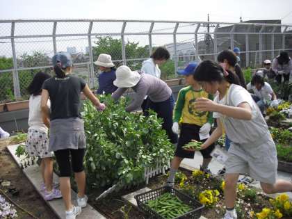 午後2時より、上緑会の総会が開かれました。年間活動計画、学校側担当者の紹介、グループごとの紹介後、4月に種まきをして持ち帰り、1ヶ月間各家庭で育てていただいた野菜や花の苗の植え替えをしました。ソラマメの収穫もしました。