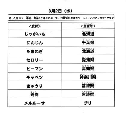 本日の給食で使用した主な食材の産地は以下の通りです。