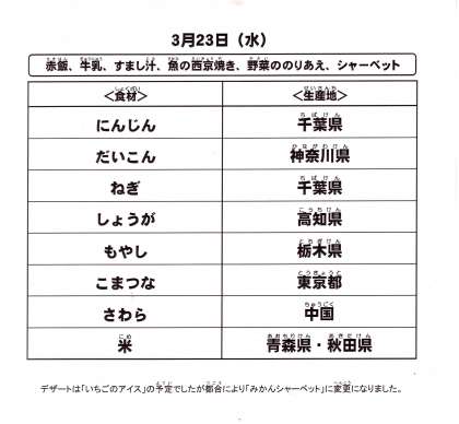 本日の給食で使用した主な食材の産地は以下の通りです。