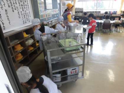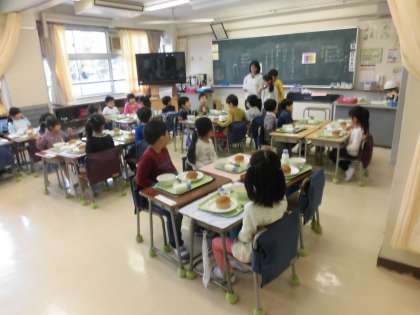 入学したばかりの1年生が、今日から給食です。机並べ、テーブルクロス、手洗いと一つ一つ手順を教えてもらって準備をしました。給食当番も白衣を着てしっかりお手伝いができました。お行儀よくいただきますもごちそうさまもできました。