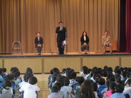 今日は、離任式がありました。三月に東玉川小学校を去られた先生、栄養士さん、主事さん方が1か月ぶりに学校に来ました。代表の人がお別れの手紙を読んで花束を渡しました。