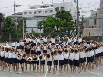 演技に入る前の準備運動は、伝統のストレッチとリズムダンスです。