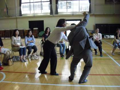 4校時は、参加していただいた地域・保護者の皆様と警察、学校、NTTの方々との懇談会がありました。携帯電話についての質問が多くだされました。最後に簡単な護身術を教えてほしい・・・という参加者からの希望があり、玉川警察署の方々にお手本をみせていただきました。
