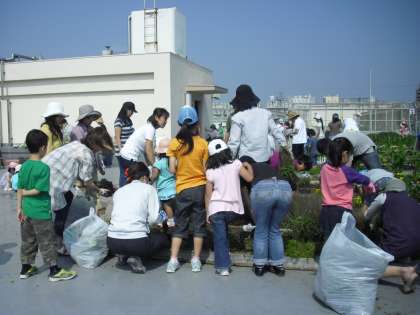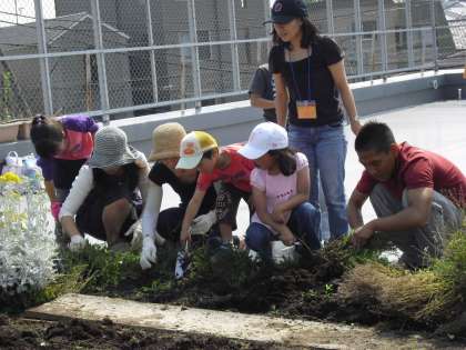 花アドバイザーの大田さんや野菜アドバイザーの久保さんのご指導をいただきながら、苗の植え替えや花殻つみなどをしました。中学生や入学前の子どもたちも手伝ってくれました。