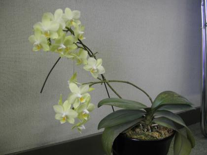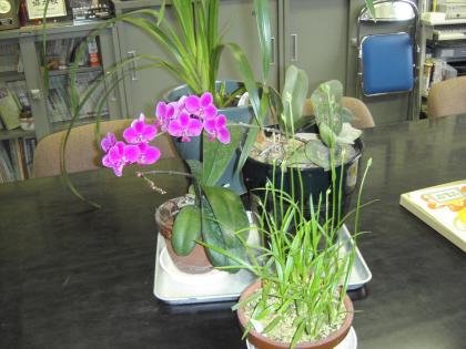 写真は、校長室で咲いている3年越しのファレノプシスです。1ヶ月以上咲いています。右側の写真は、4年越しのファレノプシスと、今年届けられたシンビジュームです。手前のすんなり伸びた植物は、サギソウです。本校の上緑会でお世話になっている方からいただきました。